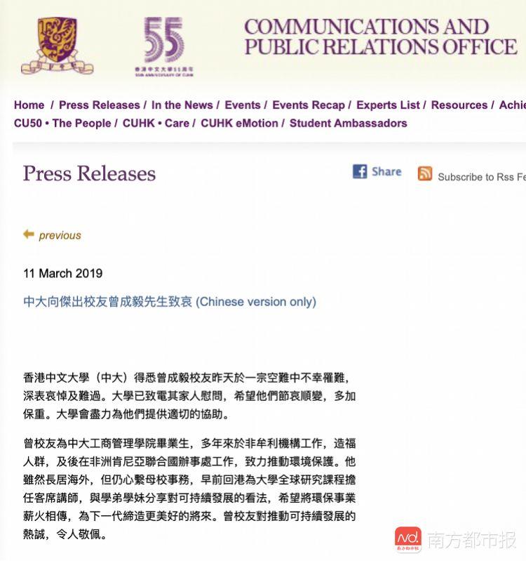 3月11日,香港中文大学发文悼念曾成毅,“港中大得悉曾成毅校友昨天于一起空难中不幸罹难,深表哀悼及难过。”香港中文大学表示,目前已致电其家人慰问,学校会尽力为家属提供适切的协助。