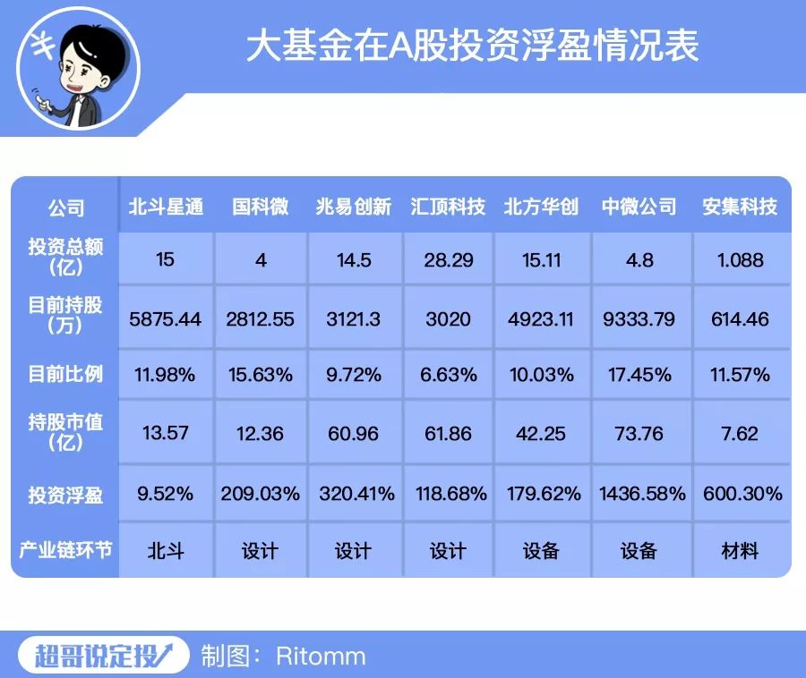 等三家公司上的浮盈分别为46.46亿元、33.57亿元、12.36亿元,浮盈幅度分别为超过3倍、超过1倍、超过2倍。是不是很恐怖的收益,跟着大基金不是吃肉,而是吃自助啊,胃口有多大,就可能吃多大。