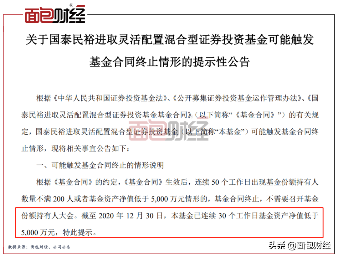 2020年末,国泰民裕进取发布“可能触发基金合同终止情形的提示性公告”。公告显示,“截至2020年12月30日,本基金已连续30个工作日基金资产净值低于5000万元”。
