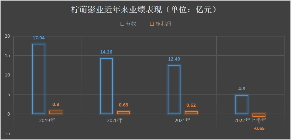 整体来看,2019年至2022年上半年,柠萌影视的营收分别为17.94亿元、14.26亿元、12.49 亿元及4.8亿元,对应报告期内利润分别为0.80亿元、0.63亿元、0.62亿元、-0.65亿元。
