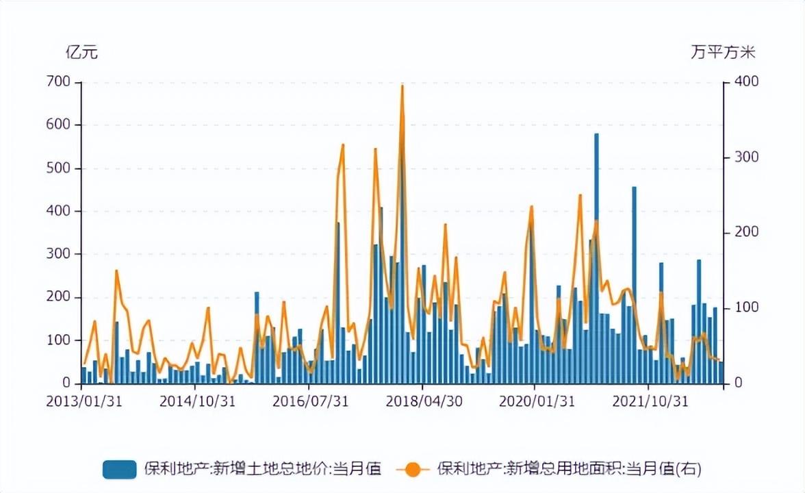 根据wind数据统计,2018年6月至2019年5月,保利发展共新增土地1030.717万平方米,总价值1390.94亿元,均价13494.88元,2019年6月至2020年5月,共新增土地1220.91万平方米,总价值1871.9亿元,均价15332元。均价增长了13.6%。