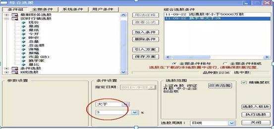 换手大于3%是一只股票活跃的最低表现,太大则小心已经上涨太多回调,这个数据自己揣摩设定。设定好了点加入条件,右框出现2个条件了。