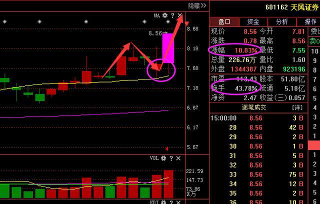 中换手率:我们可以把换手达到4%以上的称为中换手率。(中换手的标准是换手基本在4%左右,这类型的个股可以关注)
