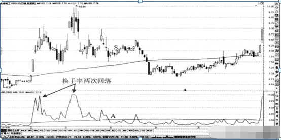 要点1:图4-13显示,当换手率指标从高位回落时,指标明显连续两次达到低点。这个时候,图中A位置的换手率已经很难大幅度回升,对应的价格S位置提示我们高抛。