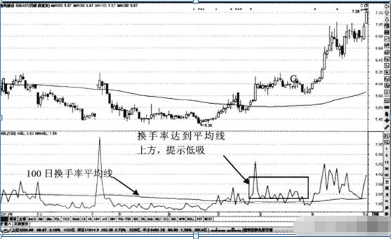 要点1:如图4-15显示,当该股换手率指标达到100日平均换手率以上时,股价走势显然比较强。这个时候,我们可以在换手率继续回升前低吸。换手率指标已经走强,股价回升趋势必然加强,低吸机就会出现。