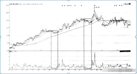 庄家吸筹往往会在筹码分布上留下一个低位密集区,一旦时机成熟,庄家从低位密集区的下方首先将股价拉抬到密集区的上方,形成对筹码密集区的向上穿越,股价上穿密集区而呈现无量状况,这时我们就可知道该股已由庄家高度持仓了。