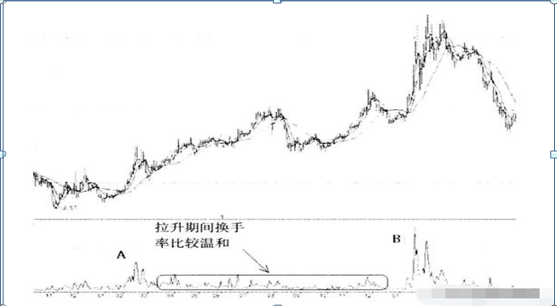在之后的拉升过程中,图中B位置处的换手率始终维持在5%—20%。这么高的换手率配合股价缓慢上涨显然不是一般的散户能够达到的。庄家在花大力气建仓,才导致换手率不断维持在高位。