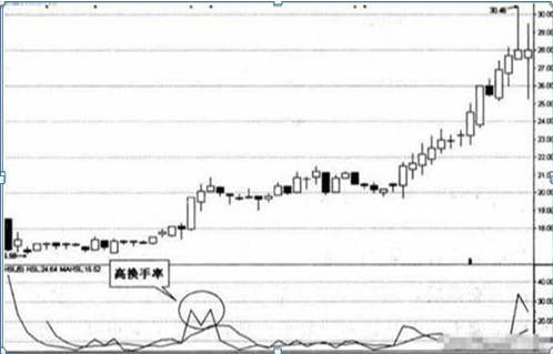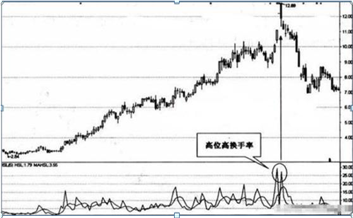 个股在相对高位突然出现高换手率而成交量突然放大,一般成为下跌前兆的可能性较大。这种情况多伴随有个股或大盘的利好出台,此时,已经获利的筹码会借机出局,顺利完成派发,“利好出尽是利空”的情况就是在这种情形下出现的。对于高位高换手率,投资者应谨慎对待。