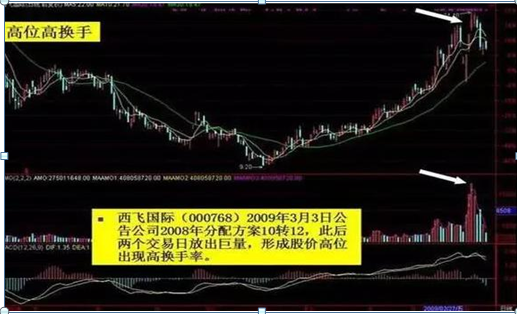 5、在相对高位突然出现高换手率且成交量突然放大,一般成为下跌前兆的可能性较大。这种情况多伴随有个股或大盘的利好出台,此时,已经获利的筹码会借机出局,顺利完成派发,“利好出尽是利空”的情况就是在这种情形下出现的。对于高位高换手率,投资者应谨慎对待。