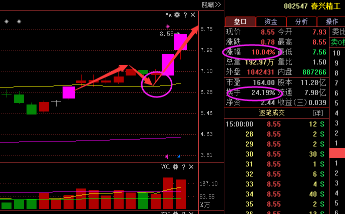 春兴精工,同样也是换手率选股法选出来的,已经两个涨停,目前还非常的强势,这样的选股法选出大涨的股票还是很简单的。