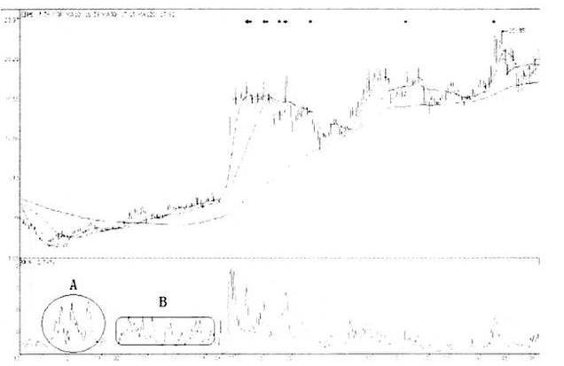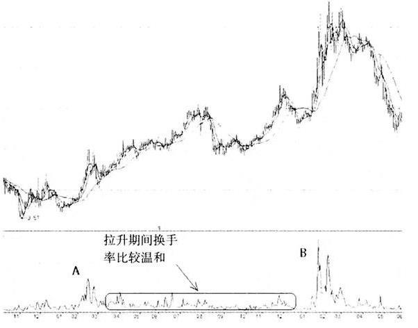 如图5所示,皖通高速虽然算不上是2008年底到2009年底的股市反弹中的大牛股,但是其中却明显看出主力的存在。图中A位置换手率的放大对应着股价的底部,这正是主力建仓所在的价位。而图中B位置恰好是主力拉升出货的位置。为什么这么说呢?因为主力放大换手率建仓和出货的动作简直是太明显不过了。通过分析换手率,主力的行踪就一目了然了。