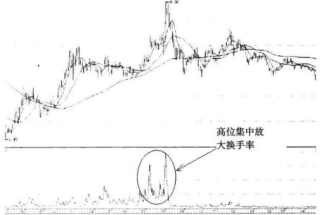 如图3所示,华电国际在见顶的时候,股价经过最后的疯狂拉升,终于快速回落了。如果说在股价被拉升的时候,主力的动向还不是很明显,那么在出货的时候,主力的“狐狸尾巴”已经充分地暴露出来了。图中所示的巨大换手率就很能说明问题。主力出货时放大的不仅仅是成交量这一个指标,股价快速见顶回落中还暗藏着大量的股票被换手。筹码在短时间内从主力的手里转移到散户的手里时,换手率这一指标一定是非常大的。图中出现的换手率的两个明显峰值就说明了问题的实质。