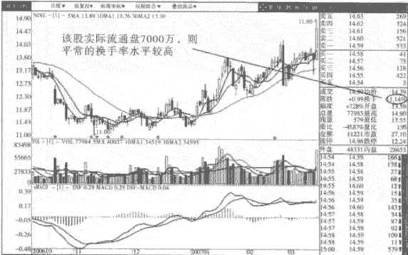 看下面云南盐化(如图下所示),它的实际流通盘是7000万,则平时的换手率水平较高,保持在6%左右。