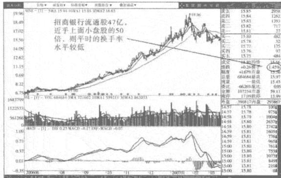 而招商银行(如图下所示)实际流通盘有47亿,则平时的换手率水平就低,保持在4%左右。