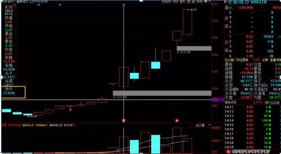 比如全柴动力(600218),前期横盘震荡时,换手率都不到1%,1月15日在拉升的过程中出现了13.87%的换手率,说明主力已经有所动作,可以择机介入。