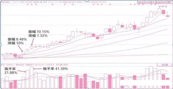 图是天赐材料K线图,该股受益于锂电池行业景气度的大幅提升,受到各路资金的追捧,因为该股前期并没有主力资金建仓,不属于中长线资金运作,该股每天的换手都在20%左右,最高一天的换手率达到40%以上,表明完全是游资击鼓传花式炒作,是一支游资参与度非常高的个股,其一般具备较强的持续性。凡是游资炒作的个股必须保持持续均匀的高换手率,否则股价将不会持续上涨。
