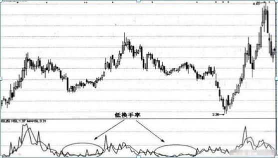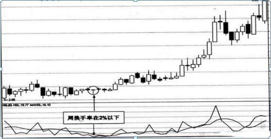 在多数情况下,过低或过高的换手率是股价变盘的先行指标。一般而言,在股价出现长时间调整后,如果连续一周多的时间内换手率都保持在极低的水平(如周换手率在2%以下),则往往预示着多空双方都处于观望之中。由于空方的力量已经基本释放完毕,此时的股价基本已进入底部区域,此后很容易出现上涨行情。
