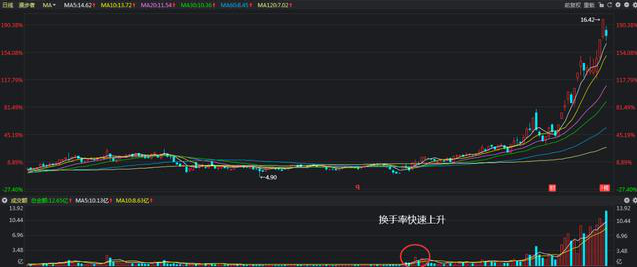 比如说一只股票平时的换手率只有5%以下,然后突然换手率提升到10%以上,说明这只股受到市场关注,开始明显活跃,在每一阶段的牛股,一般换手率都会出现明显的上升,比如下面这只股票:漫步者。