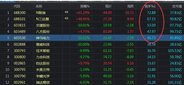 换手率超过45%的股票一共只有四只,其中N瑞联和N三达膜是科创板公司上市首日,其他三只交建股份、八方股份、神马电力均为次新股。