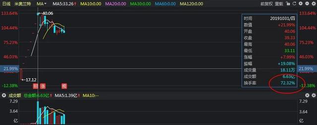 除了科创板新股上市外,就是非科创板的次新股了,当这些新股终结连续涨停后,换手率就会大幅增加,一般在开板日前换手率会超过1.5%,开板日则会超过50%,比如说创业板的这只次新股米奥兰特,2019年10月30日继续涨停,但换手率升至1.57%,10月31日米奥兰特开板,换手率高达72.32%。