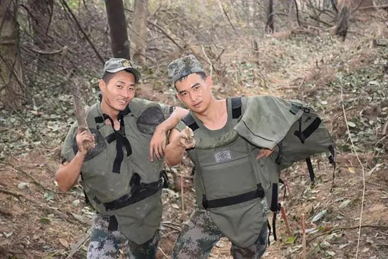 10月11日这天下午,扫雷工作正在紧张地进行,根据以往的安排,扫雷会分成两人小组进行,杜富国和战友艾岩穿着防爆服压低身子走在树枝缠绕的陡坡上。