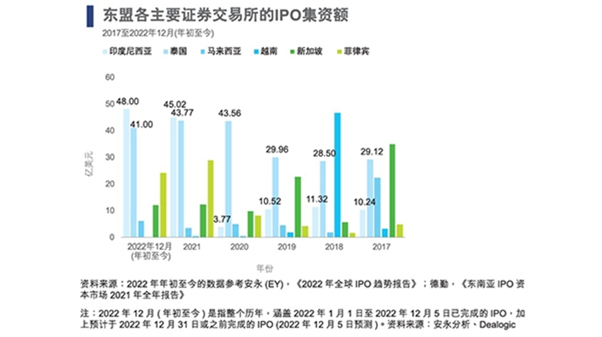 一直以来,印尼公司均依靠当地股票证券市场来满足扩展业务的资金需要。在2019至2022年期间,印尼并无公司在海外上市。然而,过去数年,IDX的IPO势头却非常强劲,以宗数计,自2018年起一直是东盟主要市场之最。去年,IDX的IPO集资金额领先东盟市场,突显印尼企业的资金需求与日俱增。除印尼最大科技公司GoTo Group于去年进行IPO外,近年当地较瞩目的还有Bukalapak和PT Dayamitra Telekomunikasi Tbk的IPO,两家公司在2021年各集资超过15亿美元(折合约104亿元人民币)。在2017至2022年期间,印尼的IPO年均集资额达21亿美元(折合约145亿元人民币),在东盟仅次于泰国。此外,印尼政府亦推出多项优惠政策,支持企业在IDX上市。