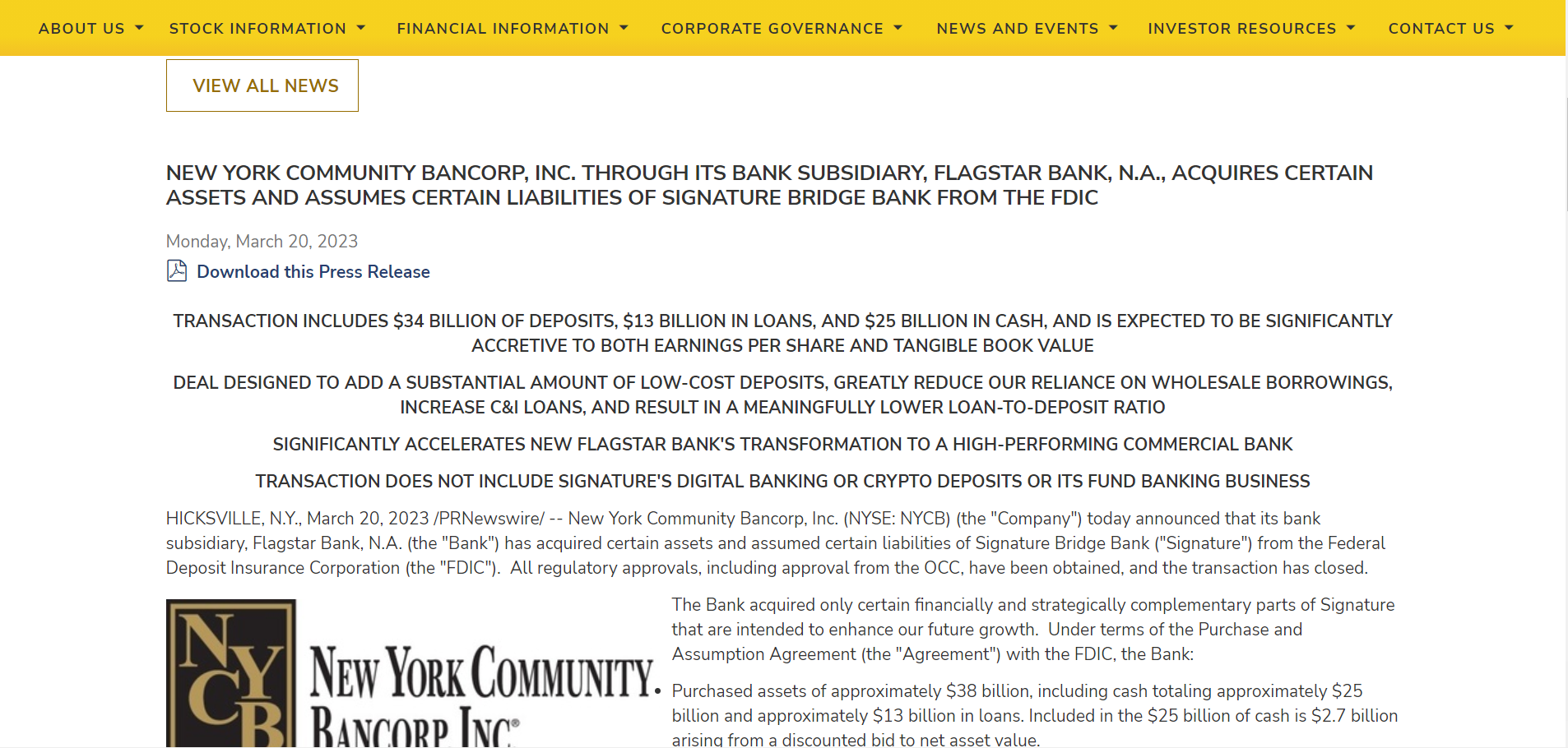3月20日,纽约社区银行公司宣布,其银行子公司旗星银行已从联邦存款保险公司(“FDIC”)处收购签名银行的部分资产和承担部分负债。已获得所有监管部门的批准,包括美国货币监理署的批准,并已完成交易。