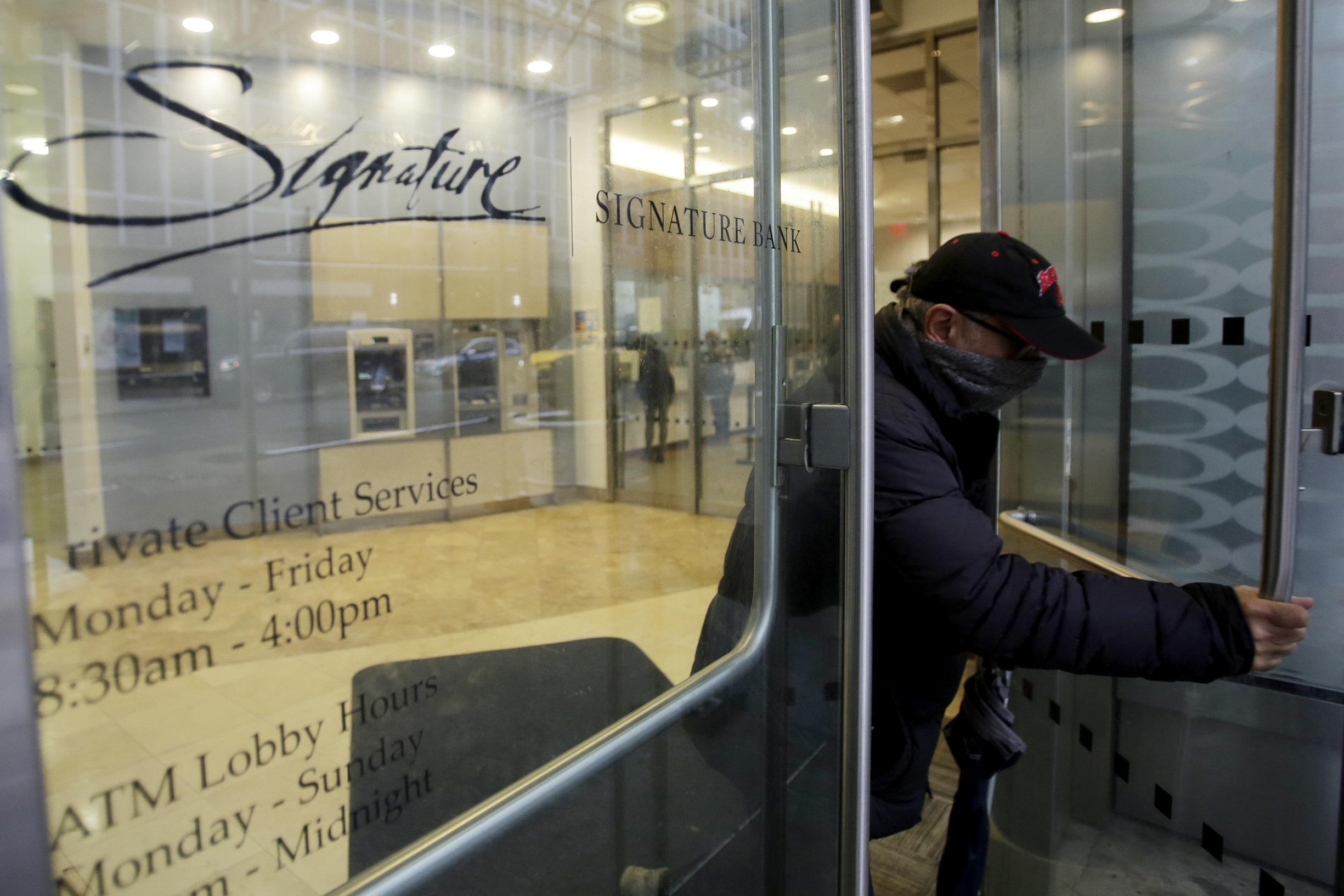 当地时间2023年3月13日,纽约市,一名男子走出签名银行分行(图片来源:视觉中国)