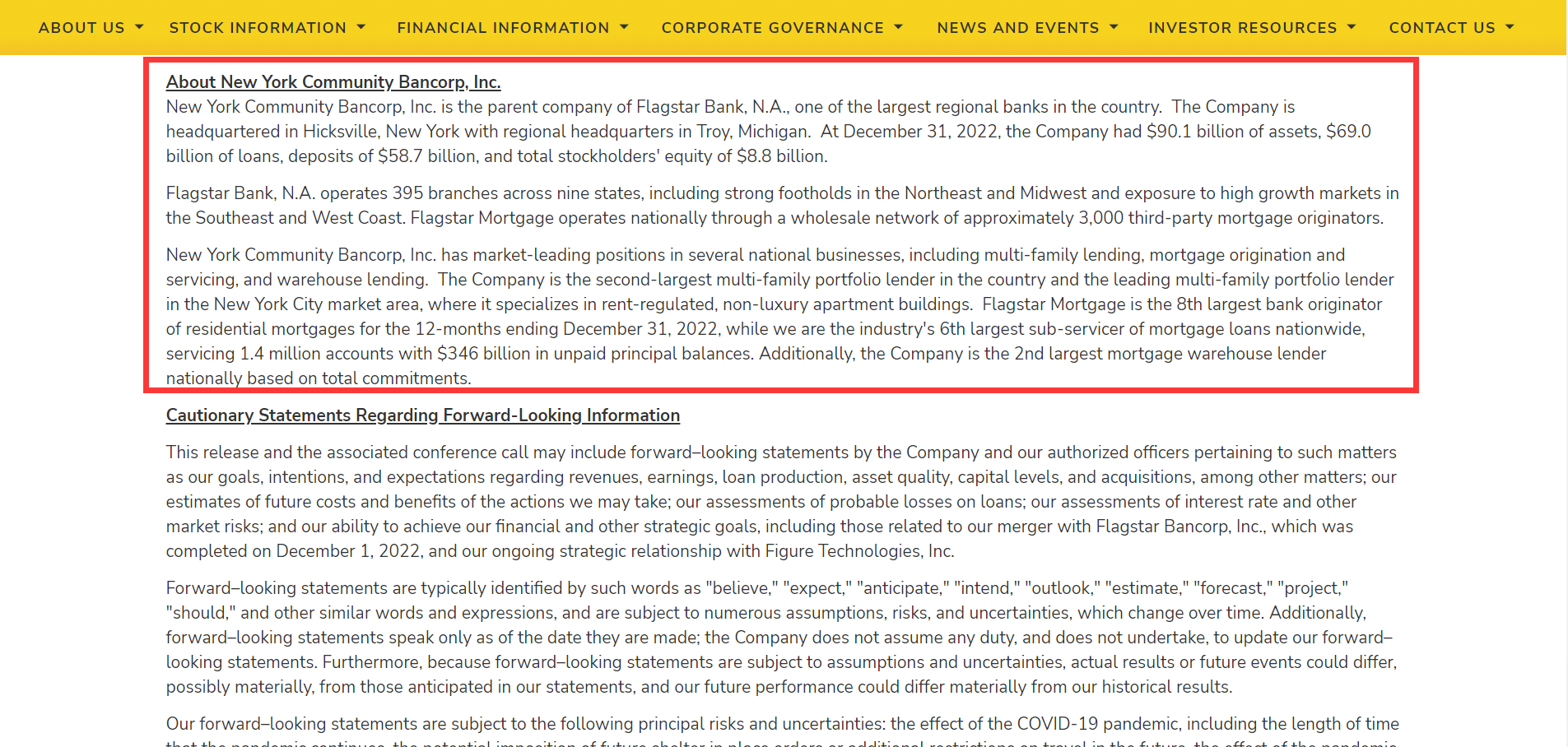 纽约社区银行是旗星银行的母公司,该公司总部位于纽约州希克斯维尔,区域总部位于密歇根州特洛伊。截至2022年12月31日,