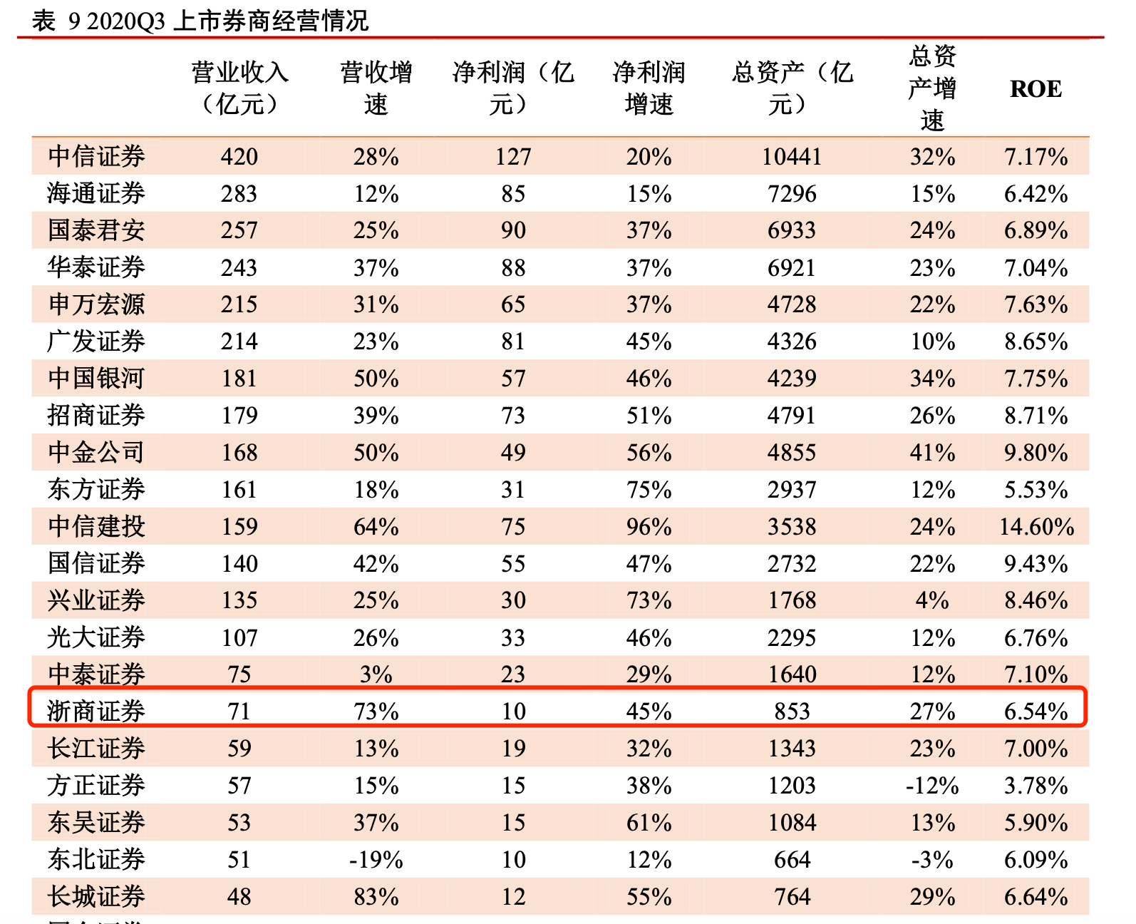 整体来看,2020年前三季度,浙商证券共实现营收71亿元,同比增长73%,在整个上市券商营收增速中位列第三,仅低于红塔证券和长城证券;实现净利润10亿元,同比增长45%,该增速相比行业就有些失色。