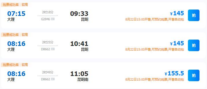 根据行程安排,第5天从大理乘坐动车返回昆明,大理到昆明的动车票最低价格为