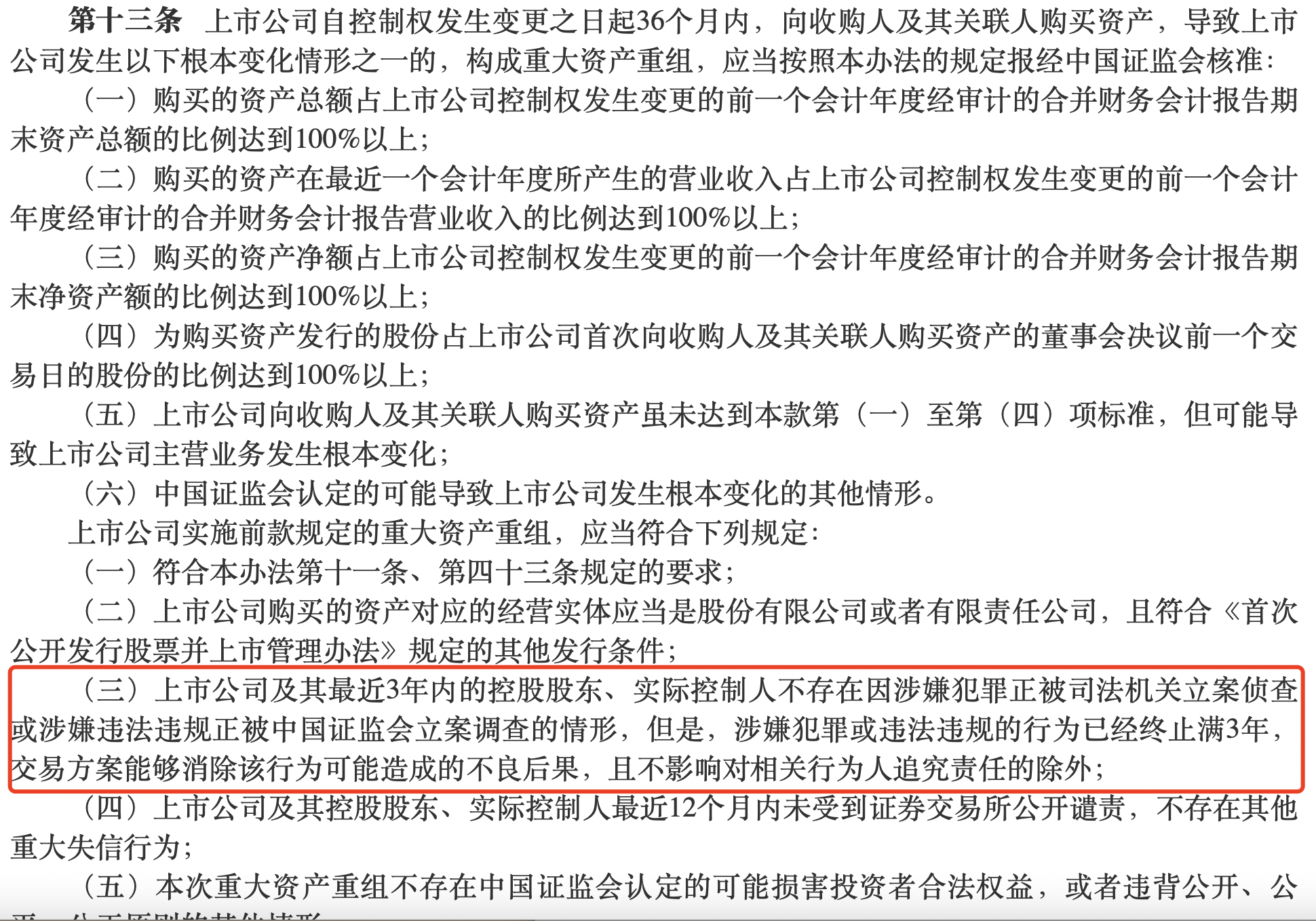 根据《上市公司重大资产重组管理办法》,上市公司自控制权发生变更之日起36个月内,向收购人及其关联人购买资产,构成重大资产重组的,应当符合的规定中包括“上市公司及其最近3年内的控股股东、实际控制人不存在因涉嫌犯罪正被司法机关立案侦查或涉嫌违法违规正被中国证监会立案调查的情形”。