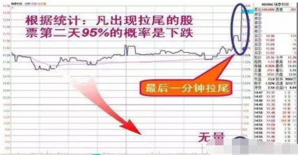 收盘前的急拉(拉尾):有时候,个别股票在收盘前的一瞬间出现突然大幅拉长的现象;这种拉长的特点是超大单成交,分时图出现一条直线上冲走势,中间没有任何成交停顿现象。其目的为第二天出货做图形。出现拉尾一定跑。