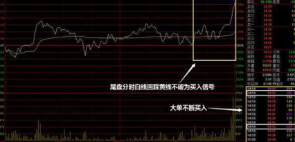 形态选择好之后,我们在看看分时图,入股此时分时白线是回踩黄线不破并处于上升趋势,而且持续有大单买入,这就是我们要在尾盘买进的强势个股,次日冲高获利高抛即可。