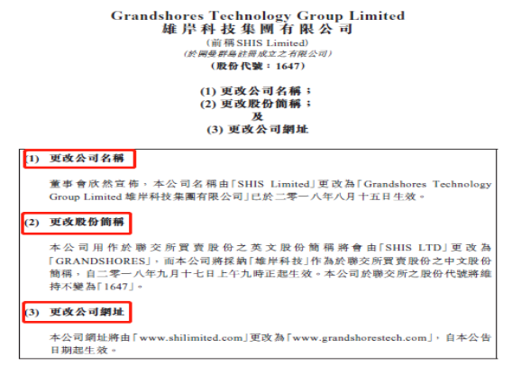9月12日,SHIS LTD(01647-HK)发布公告称,更名为“雄岸科技”,值得一提的是本次雄岸科技不单单更改公司名称,还更改了股份简称与公司网址。其实,上市公司证券简称往往是给投资者的首张名片,一般情况下,上市公司的名字都会体现出公司的行业背景(如某某地产、电器、设备等),让投资者一眼意会该公司所属的行业,而上市公司改名往往意味着企业发展方向可能出现改变,即有“改名换命”的说法。从二级市场股价表现上来看,大部分上市公司改名后,股价都出现不同程度的上涨,甚至是暴涨。雄岸科技也不例外,股价在改名后,股价一改往日下跌趋势,截至9月28日收盘,雄岸科技近一周涨跌幅达45.69%,报1.690港元。