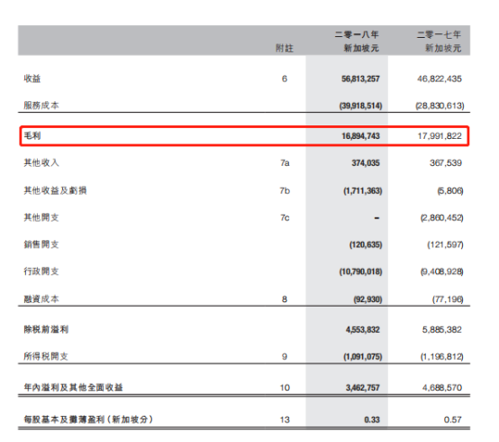 截至2018年3月31日止年度,SHIS LTD实现收益5681.33万新加坡元,同比增加21.3%;毛利1689.47万新加坡元,同比减少6.1%,毛利率较上年同期的38.4%降至29.7%;营收虽然呈现增长态势,但毛利却持续下滑。SHIS LTD将原因归于建筑及建造工程贡献的毛利率减少、外汇亏损及行政开支增加所致。