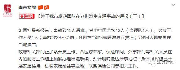 当地时间19日下午,一辆载有44名中国游客的旅游大巴,在从老挝万象前往琅勃拉邦途中发生严重车祸。事故致13人遇难,其中中国游客12人(含领队1人)、老挝工作人员1人;事故致29人受伤,分别在当地3家医院进行救治;另外4人现安置在当地酒店。
