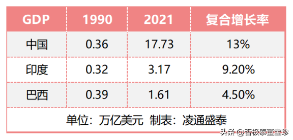 另一组对比数据是中国、印度、巴西三个国家,三国国土面积相近,1990年的GDP相同,过去30年三国GDP数据如下: