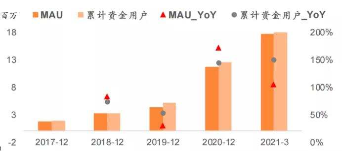 图1:Robinhood累计资金用户、MAU快速增长 来源:平安证券,36kr整理