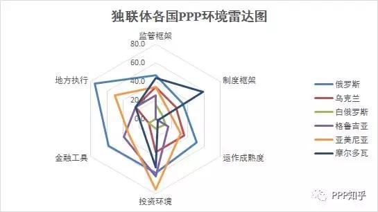 与中亚地区相似,独联体6国(俄罗斯、乌克兰、白俄罗斯、格鲁吉亚、亚美尼亚、摩尔多瓦)中除俄罗斯PPP环境发展相对均衡外(仅法律监管框架一个评估维度低于60分),其余5国普遍存在PPP宏观环境薄弱的问题,在法律制度建设方面明显不足,市场成熟度不高。但是随着区域开放程度不断提升,其投资环境向好趋势明显,多数国家得分接近60分。不过白俄罗斯的PPP整体环境较差,所有评估维度分值均在20分以下。(见下图)