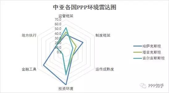 中亚3国(哈萨克斯坦、塔吉克斯坦、吉尔吉斯斯坦)的PPP国别环境呈现出明显的特点,即PPP宏观环境(包括法律监管框架、制度框架、运作成熟度和地方调节)都不尽完备,以上4个维度,3国的得分都低于40分。而投资环境和金融工具方面,哈萨克斯坦分别得分70和60,吉尔吉斯斯坦的投资环境也接近60分。