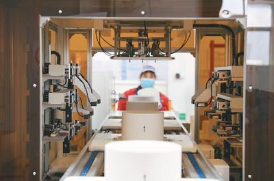 山东省东营经济技术开发区山东国瓷功能材料股份有限公司,AI工业视觉识别品质检测系统正在对生产出的汽车用蜂窝陶瓷颗粒捕捉器产品进行质量检测。 周广学摄(人民视觉)