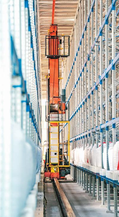 江西省新余市高新区锂电新能源产业园赣锋锂业的车间内,转运机器人、堆垛机器人等在智能程序下执行打托备货工序。 赵春亮摄(人民图片)