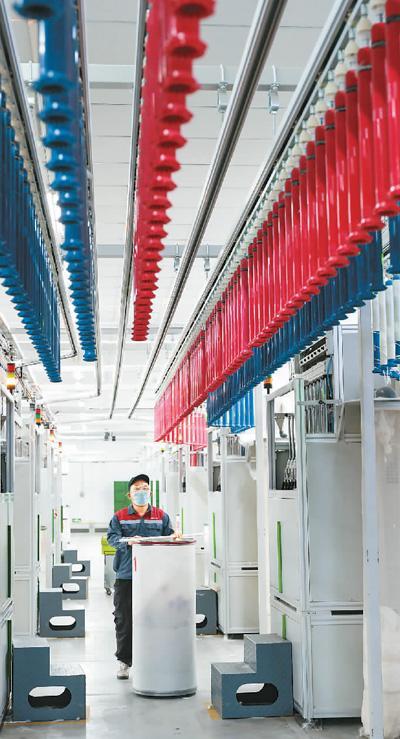 位于安徽省蚌埠市五河县经济开发区的华芳五河纺织有限公司生产车间内,工人在生产线上忙碌。该企业引进国际先进的技术设备,加快推动纺织生产数字化转型,打造出绿色环保、智能化的智慧生产线。 李向前摄(人民图片)