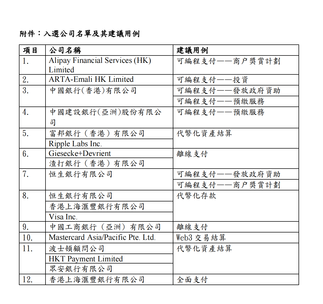 界面新闻记者注意到,香港金管局的“数码港元”主要包括六个应用类型:全面支付、可编程支付、离线支付、代币化存款、第三代互联网(Web3)交易结算和代币化资产结算。例如,支付宝(香港)参与了可编程支付类的商户奖励计划,富邦银行(香港)和Ripple Labs则共同参与代币化资产结算项目;Mastercard参与了 web3 交易结算项目,汇丰银行参与了全面支付项目。