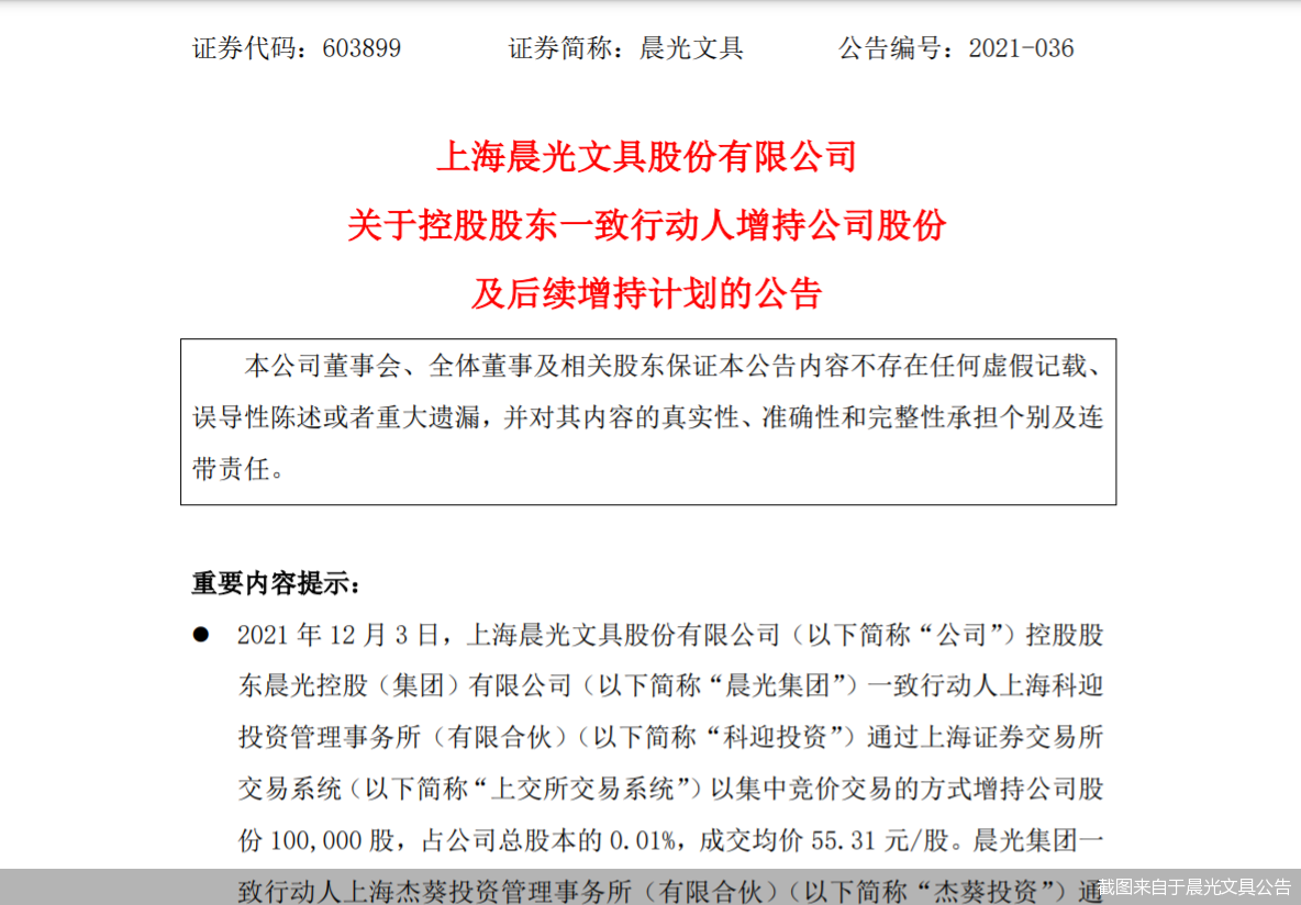 具体来看,12月3日,晨光集团一致行动人科迎投资通过上交所交易系统以集中竞价交易的方式增持公司股份10万股,占公司总股本的0.01%,成交均价55.31元/股。晨光集团一致行动人杰葵投资通过上交所交易系统以集中竞价交易的方式增持公司股份13万股,占公司总股本的0.01%,成交均价55.5元/股。