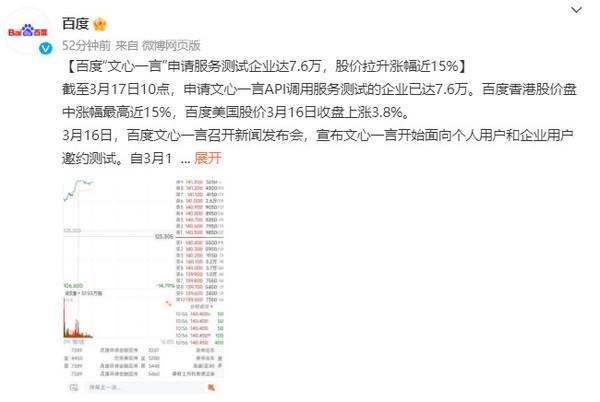 此外,根据百度公布,截至3月17日10点,申请文心一言API调用服务测试的企业已达7.6万。百度香港股价盘中涨幅最高近15%,百度美国股价3月16日收盘上涨3.8%。截至3月17日早9点,与百度智能云基于文心一言展开合作咨询达6030条。截至3月16日晚间,百度智能云已经与5家企业完成首批签约合作,并与650家企业启动签约。