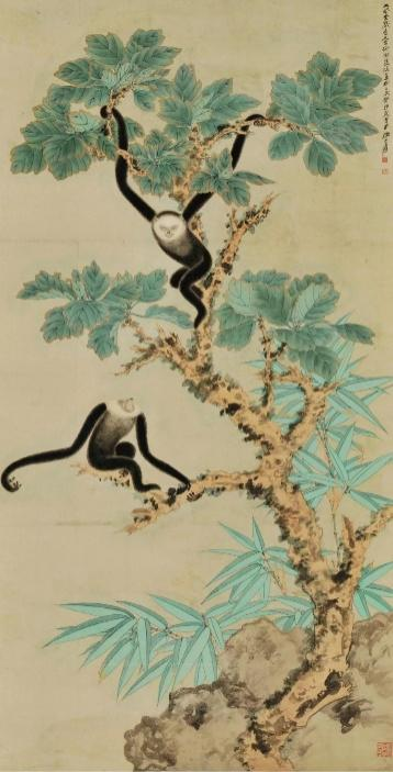张大千 檞树双猿 275×107cm 纸本设色 20世纪 中央美术学院美术馆藏