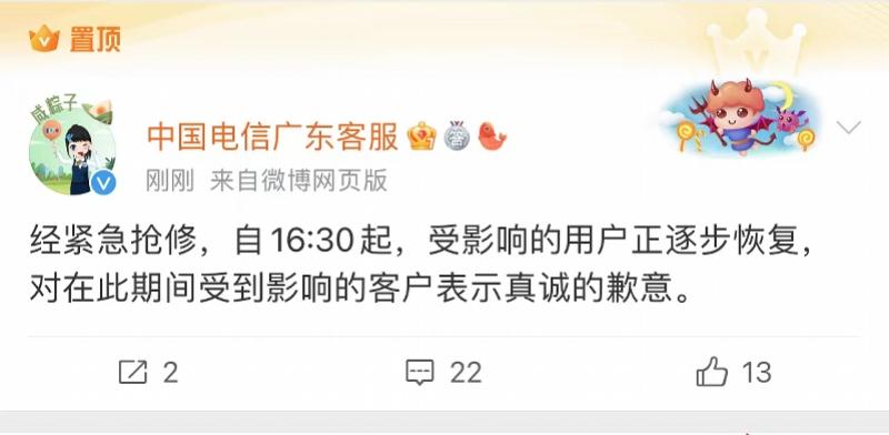 随后,中国电信广东客服在其官方微博发布声明称,“经紧急抢修,自16:30起,受影响的用户正逐步恢复,对在此期间受到影响的客户表示真诚的歉意。”