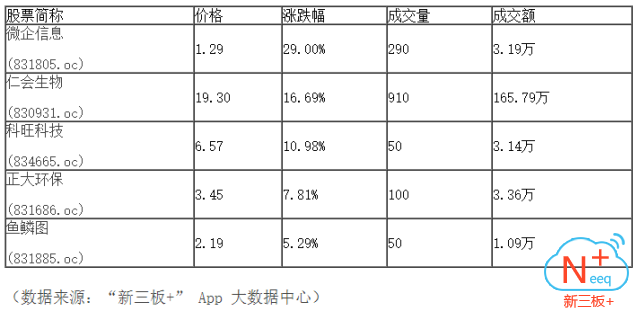 7、做市交易排行榜中,微企信息以29.00%领涨做市交易;仁会生物涨幅16.69%位列第二; 排名第三的是科旺科技,涨幅10.98%;排名第四和第五的分别是正大环保和鱼鳞图。